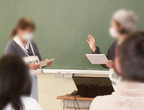 • 講話を聴いた後で、ご飯を食べたばかりなのに、「まだ食べていない!」自分の財布が「なくなった!盗まれた!」と言う認知症の母と、冷たい対応をする娘を職員が演じました。