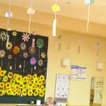 利用者の皆様から紙で作った風鈴と、ひまわり畑の夜空に打ち上がる花火を製作していただきました。 迫力ある綺麗な花火とひまわりで思い出の夏を感じ、風鈴は風にゆれるので涼しさを感じる素敵な作品となりました。